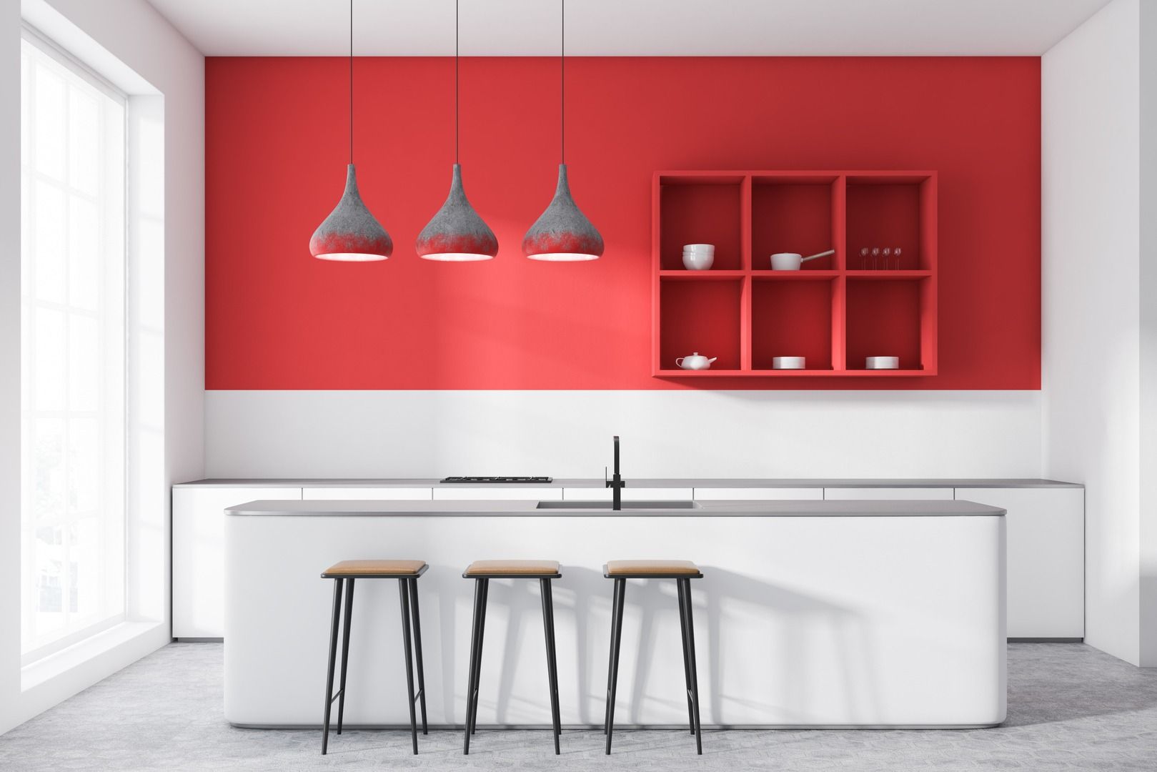 อีกหนึ่งไอเดียสำหรับการเลือกสีทาภายในสำหรับแต่งครัว โดยการใช้สีแดงเข้าเสริมผนังบริเวณเคาน์เตอร์ครัว เพื่อสร้างให้ห้องมีความน่าตื่นเต้น เร้าใจ และเสริมความรู้สึกสดชื่น มีพลังเข้าไปมากขึ้น และสามารถใช้สีขาวเข้าไปทาผนังด้านอื่นได้ด้วย เพื่อให้ห้องไม่จัดจ้านจนเกินไป บาลานซ์ให้สวยงามอย่างลงตัว